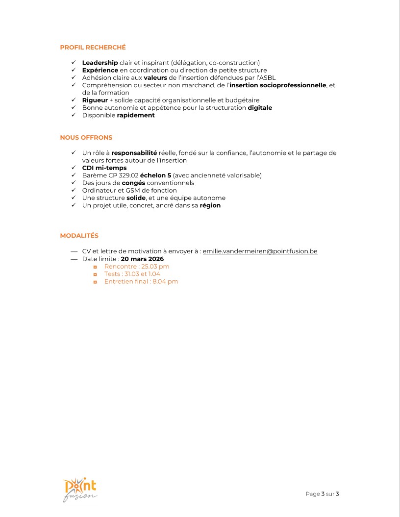 Point Fusion est un CISP (Centre d’Insertion socioprofessionnelle), agréé par la Région wallonne (N°AGR/CISP-036), pour organiser une formation en soudure et tôlerie et est reconnu par le FOREM. Anciennement appelé CFT qui se situait à Treignes.